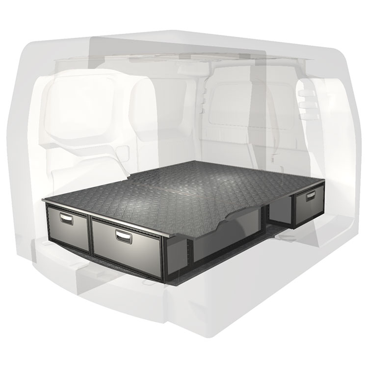 The kit is designed to be fitted on top of a Modul-Floor, utilizing the floor rails for a non-intrusive installation. The double floor is equipped with rails for easy installation of vehicle racking, and edging strips for a nice finish.