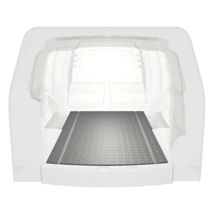 Lightweight and robust XL-floor for a Volkswagen Caddy Cargo Maxi 21- with anti-slip aluminum tread plate and cargo rails (longitudinal) for quick and safe installation of racking systems and other accessories.