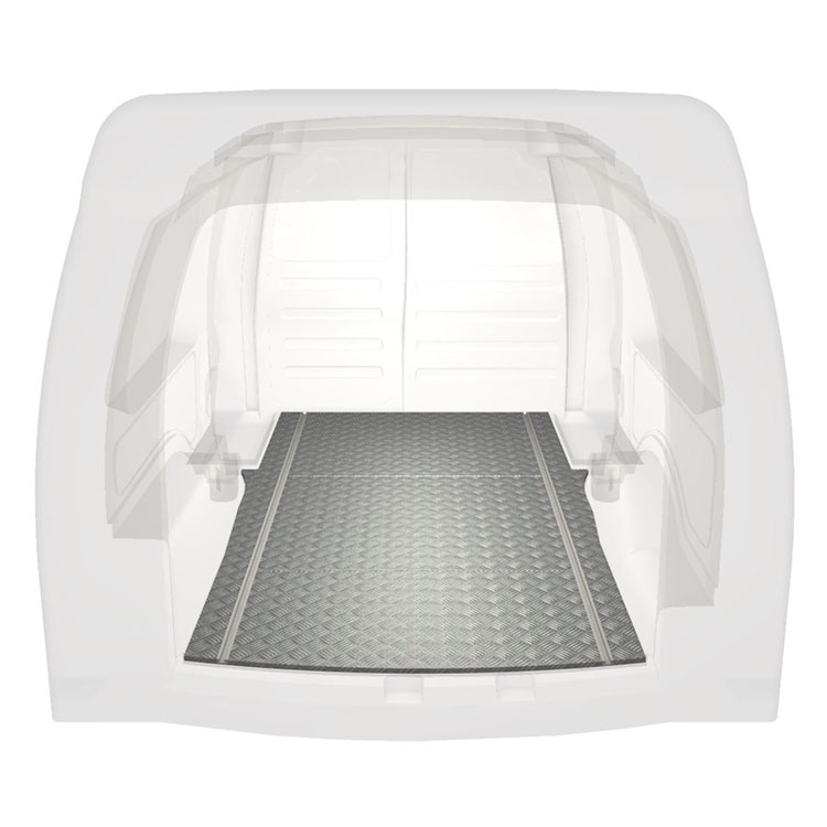 Lightweight and robust standard van floor for a Volkswagen Caddy Maxi with anti-slip aluminum tread plate and cargo rails (longitudinal) for quick and safe installation of racking systems and other accessories.