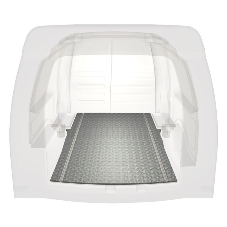 Lightweight and robust extra long floor for a Volkswagen Caddy Maxi with anti-slip aluminum tread plate and cargo rails (longitudinal) for quick and safe installation of racking systems and other accessories.
