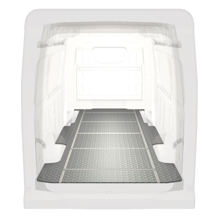 Lightweight and robust van floor with transverse rails for a Volkswagen Crafter / MAN TGE with anti-slip aluminum tread plate and cargo rails (longitudinal and transverse) for quick and safe installation of racking systems and other accessories.