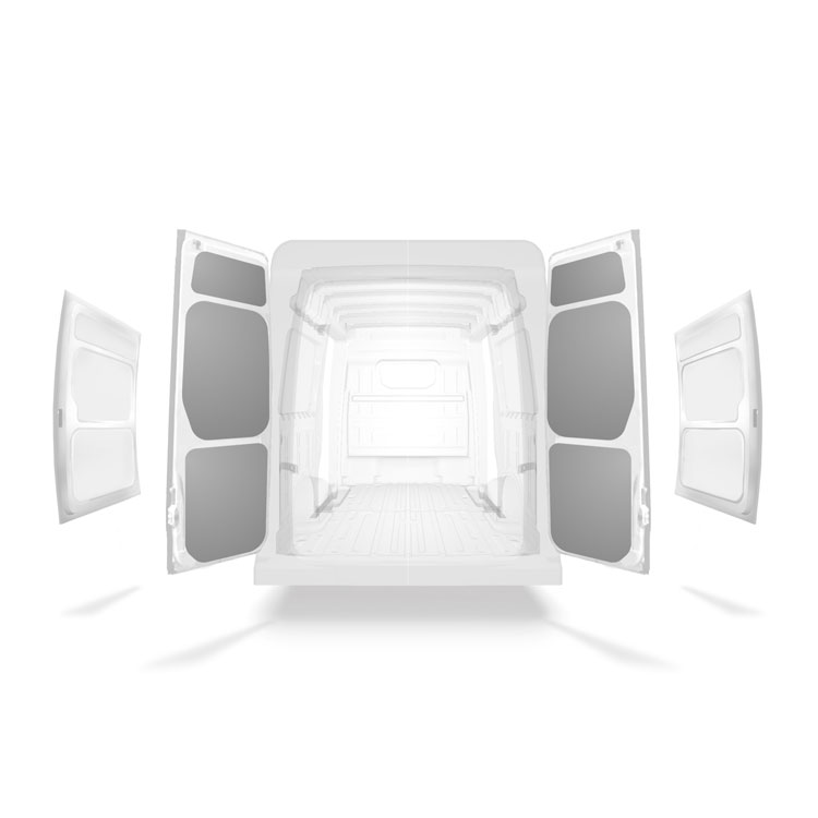 The rear door linings are designed and fabricated to fit in the sections of the rear door/tailgate of the vehicle to minimize weight. The liners protect the vehicle, create a bright working environment and are easy to wipe clean.