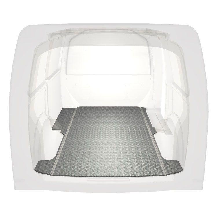 Lightweight and robust standard van floor for a Volkswagen Transporter T6 with anti-slip aluminum tread plate and cargo rails (longitudinal) for quick and safe installation of racking systems and other accessories.