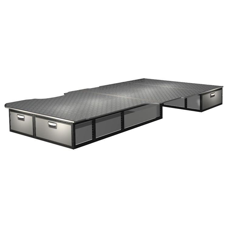 The kit is designed to be fitted on top of a Modul-Floor, utilizing the floor rails for a non-intrusive installation. The double floor is equipped with rails for easy installation of vehicle racking, and edging strips for a nice finish.