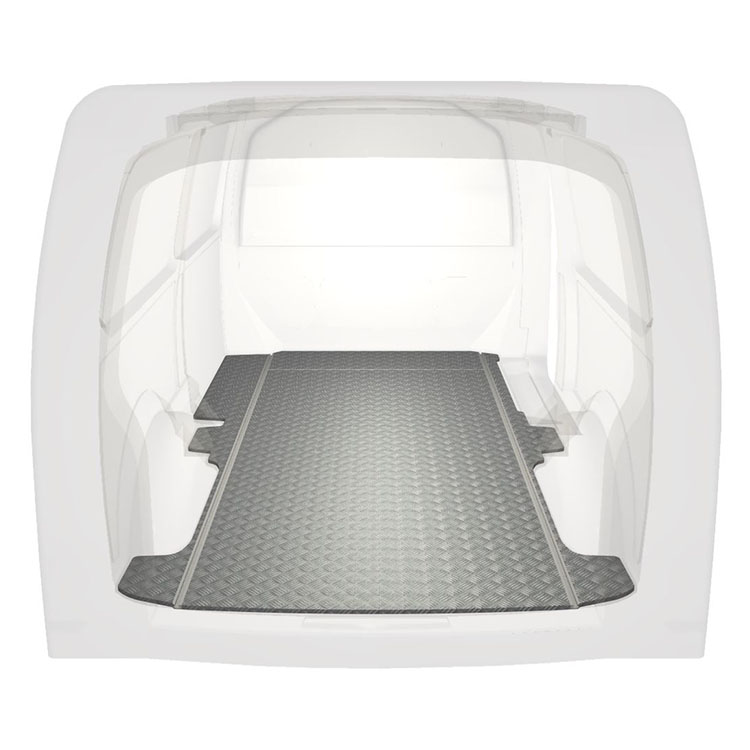 Lightweight and robust extra long floor for a Volkswagen Transporter T6 with anti-slip aluminum tread plate and cargo rails (longitudinal) for quick and safe installation of racking systems and other accessories.